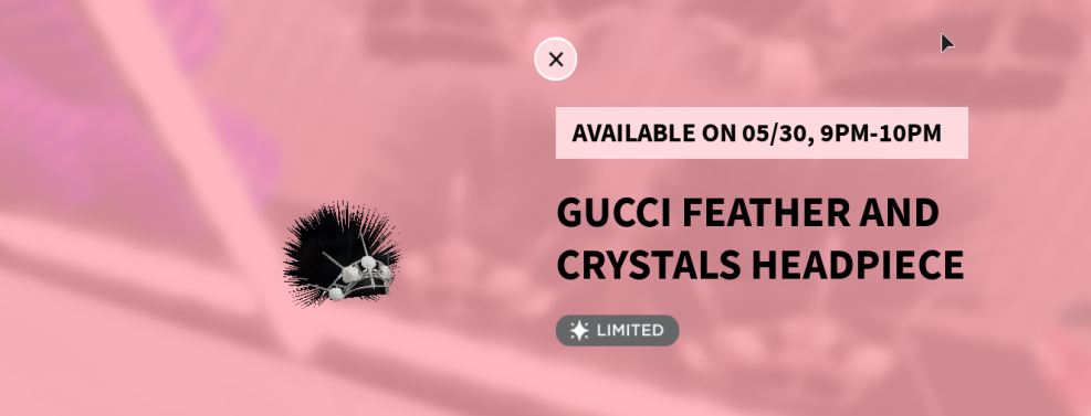 GUCCI FEATHER AND CRYSTALS HEADPIECE: Bu item 30.05.2021 tarihinde saat akşam 9:00 - 10:00 arasında gelecek olup, fiyatı artarak limited olacaktır.
